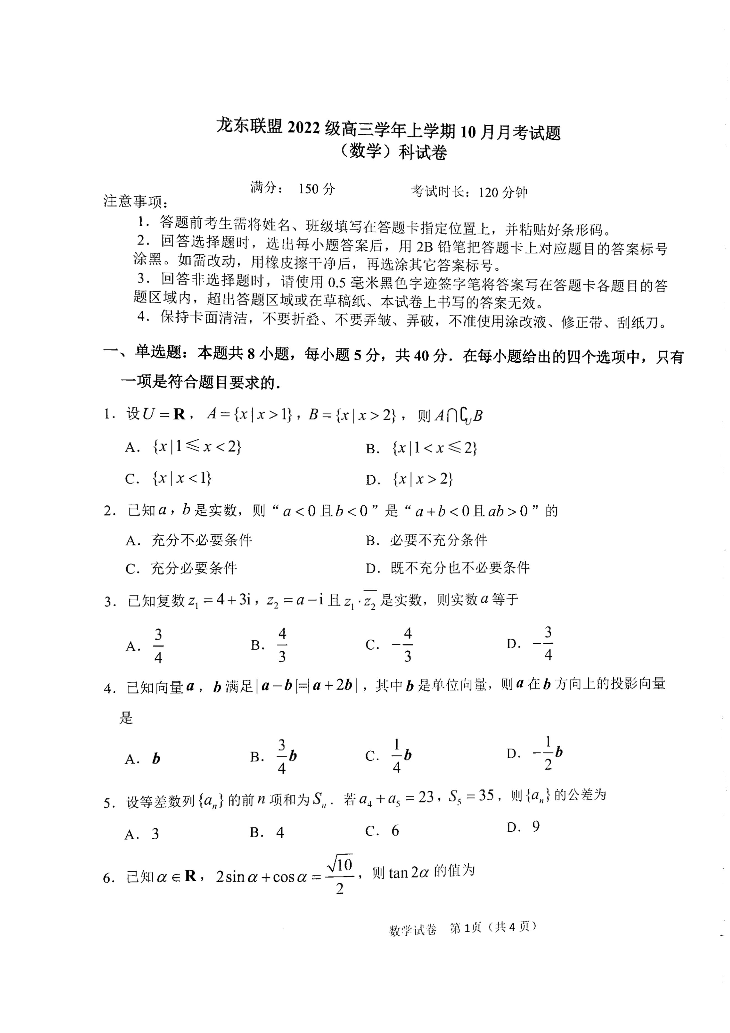 黑龙江省部分高中2025届高三上学期10月月考数学试题