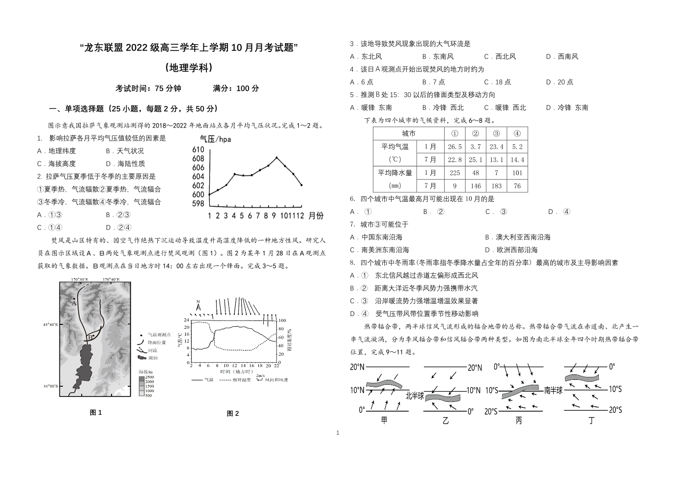 黑龙江省部分高中2025届高三上学期10月月考地理试题