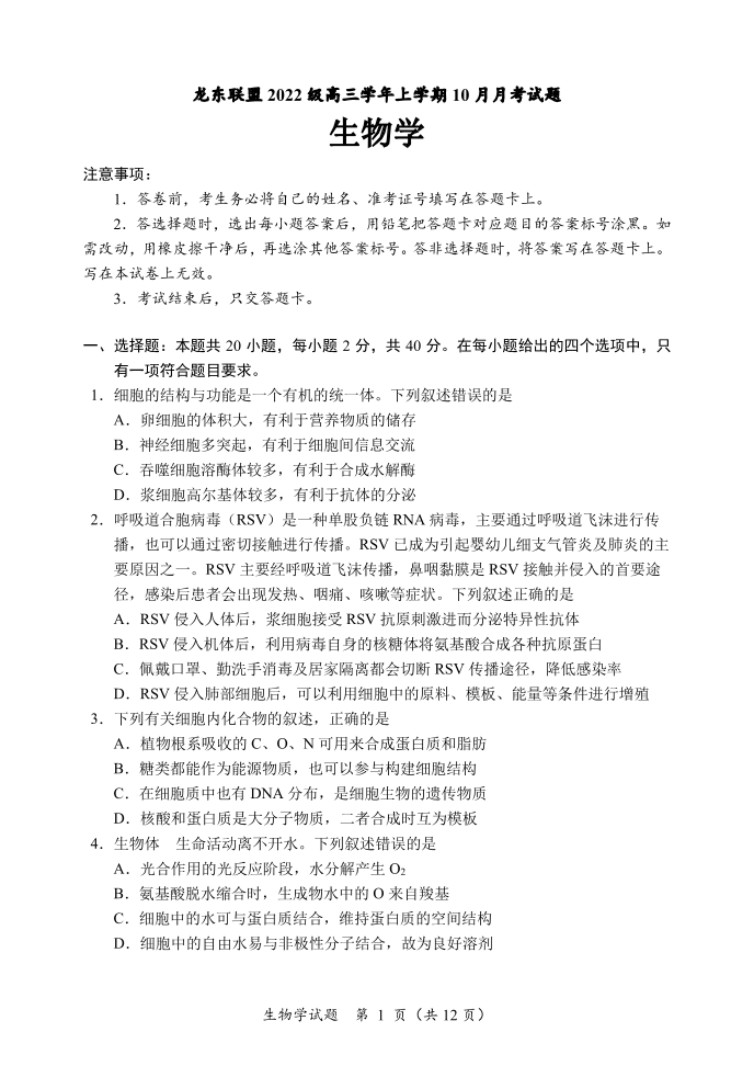 黑龙江省部分高中2025届高三上学期10月月考生物试卷