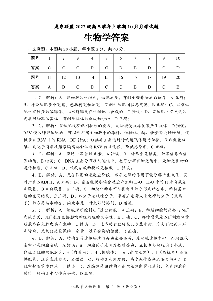 黑龙江省部分高中2025届高三上学期10月月考生物答案