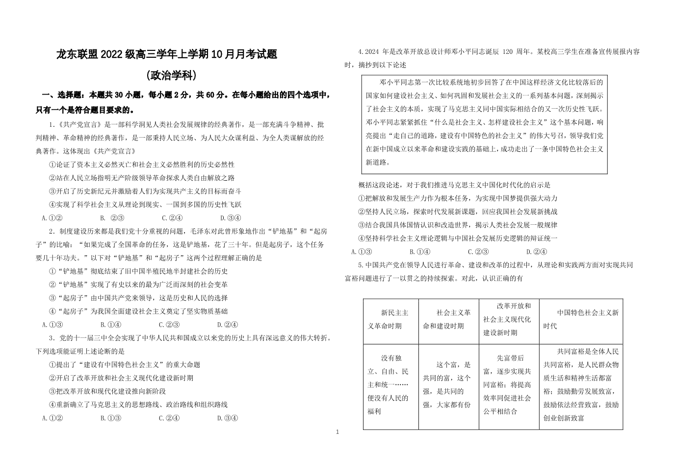 黑龙江省部分高中2025届高三上学期10月月考政治试题