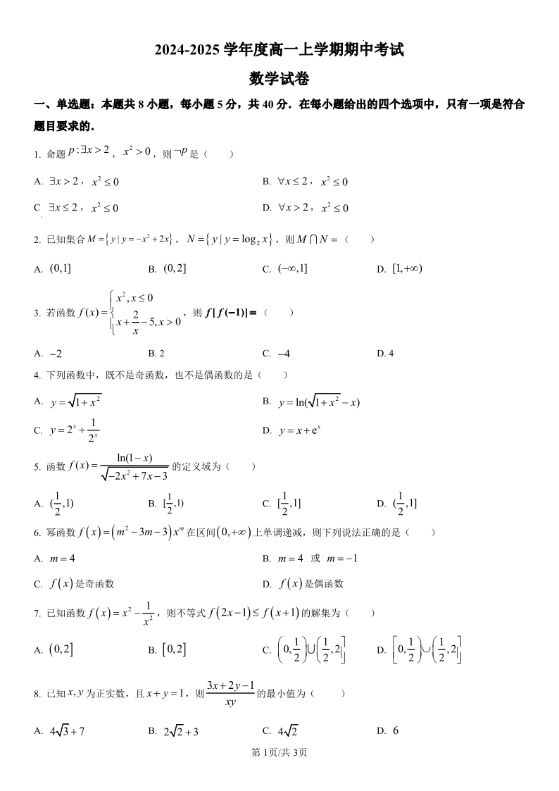 黑龙江省哈师大附中2024-2025学年度上学期高一期中考试数学PDF版含解析(可编辑)