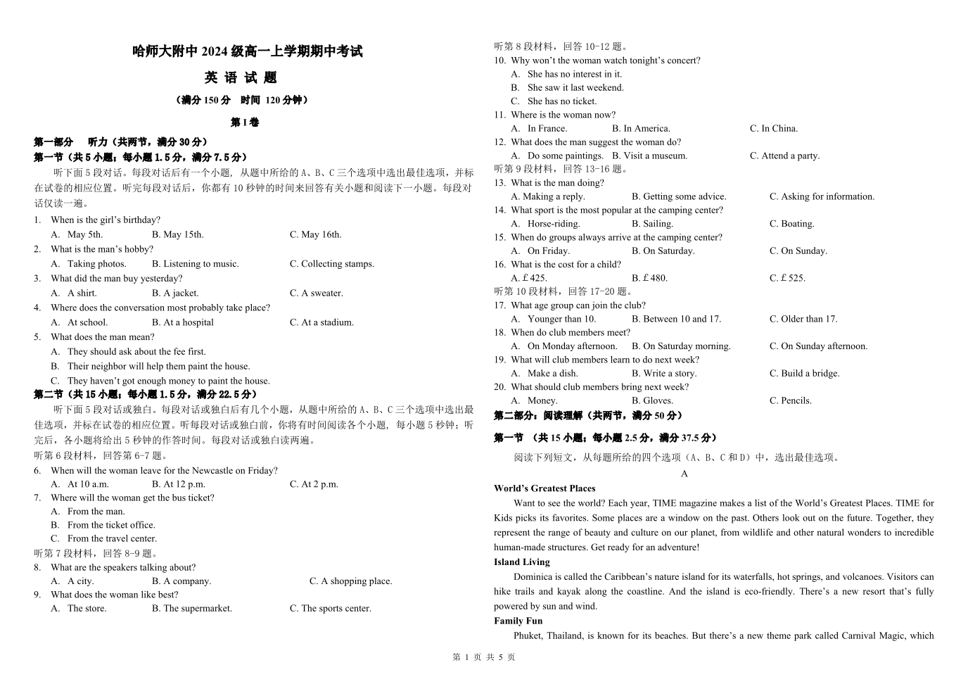 黑龙江省哈师大附中2024-2025学年度上学期高一期中考试英语 PDF版含答案(可编辑)