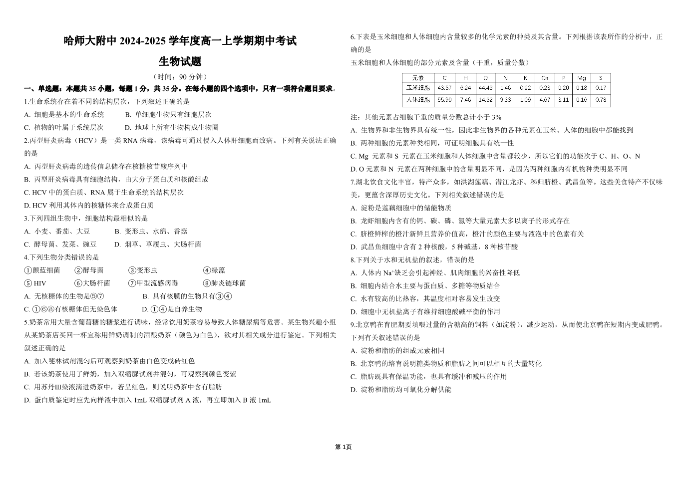 黑龙江省哈师大附中2024-2025学年度上学期高一期中考试生物 PDF版含答案(可编辑)