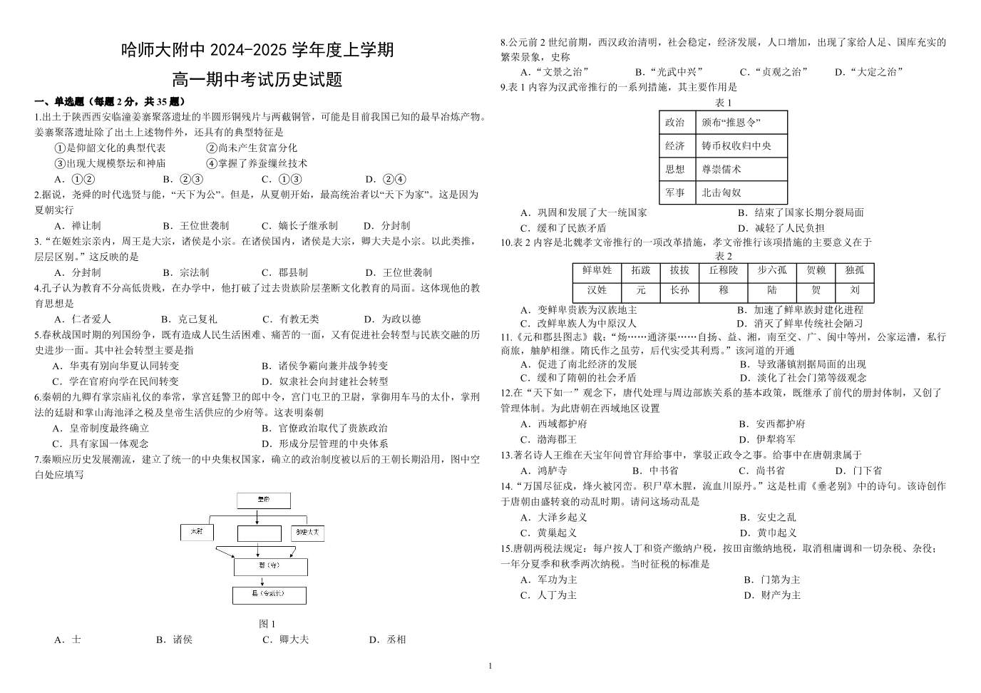 黑龙江省哈师大附中2024-2025学年度上学期高一期中考试历史 PDF版含答案(可编辑)