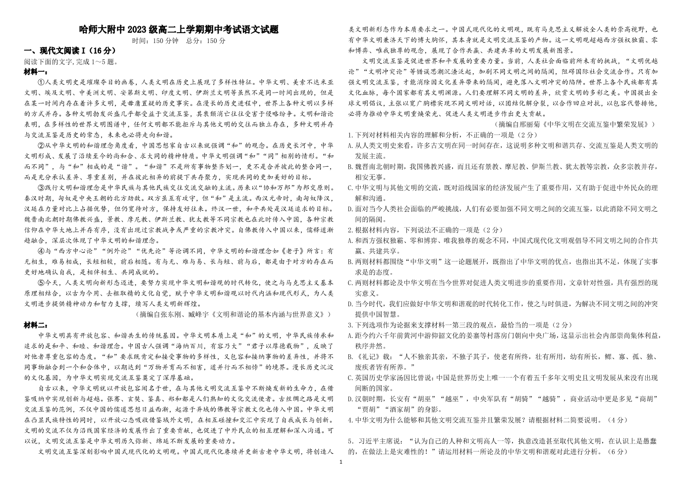 黑龙江省哈师大附中2024-2025学年高二上学期期中考试语文 PDF版含解析