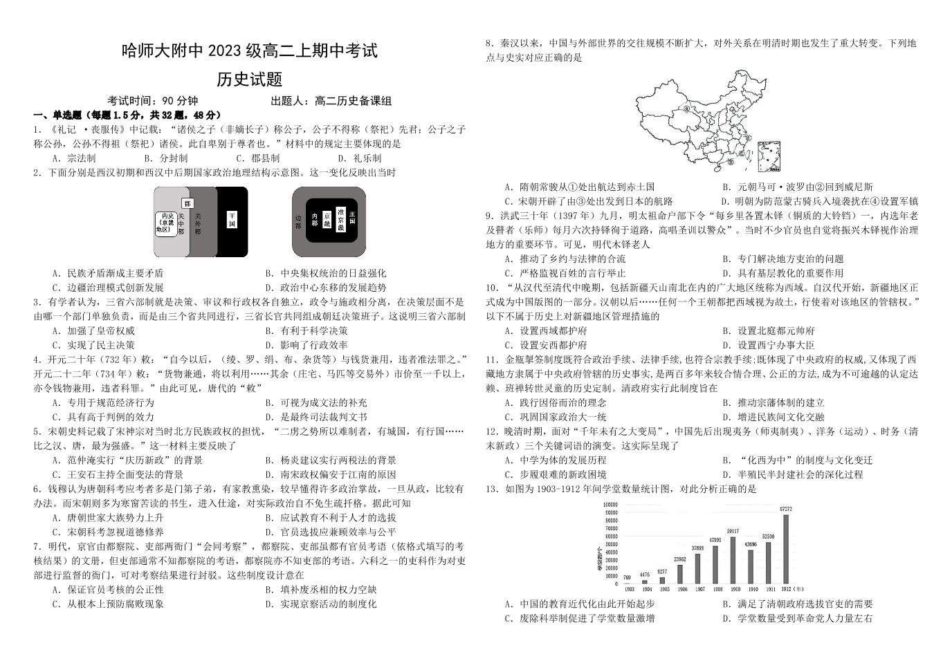 黑龙江省哈师大附中2024-2025学年高二上学期期中考试历史 PDF版含答案