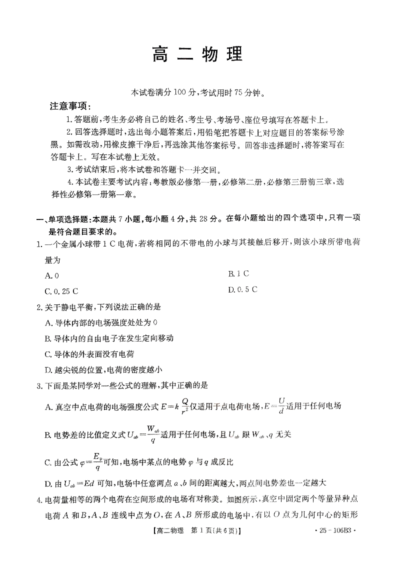 广东省湛江市2024-2025学年上学期上学期高二年级期中检测物理