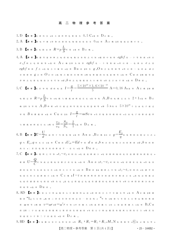 广东省湛江市2024-2025学年上学期上学期高二年级期中检测物理答案