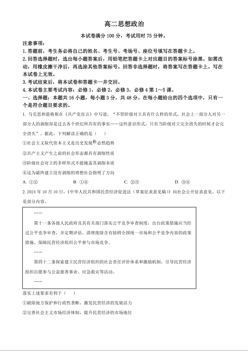 广东省湛江市2024-2025学年上学期上学期高二年级期中检测政治(原卷版)