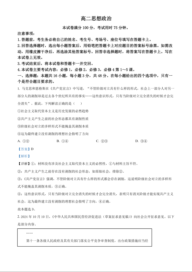 广东省湛江市2024-2025学年上学期上学期高二年级期中检测政治(精品解析版)
