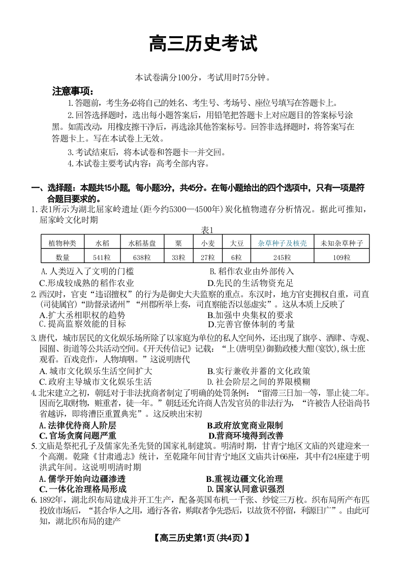 湖北省部分学校2024-2025学年高三上学期12月联考历史