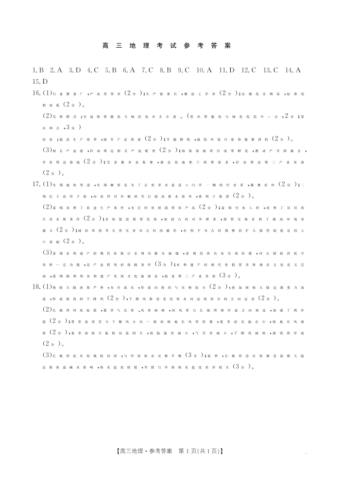 湖北省部分学校2024-2025学年高三上学期12月联考地理答案