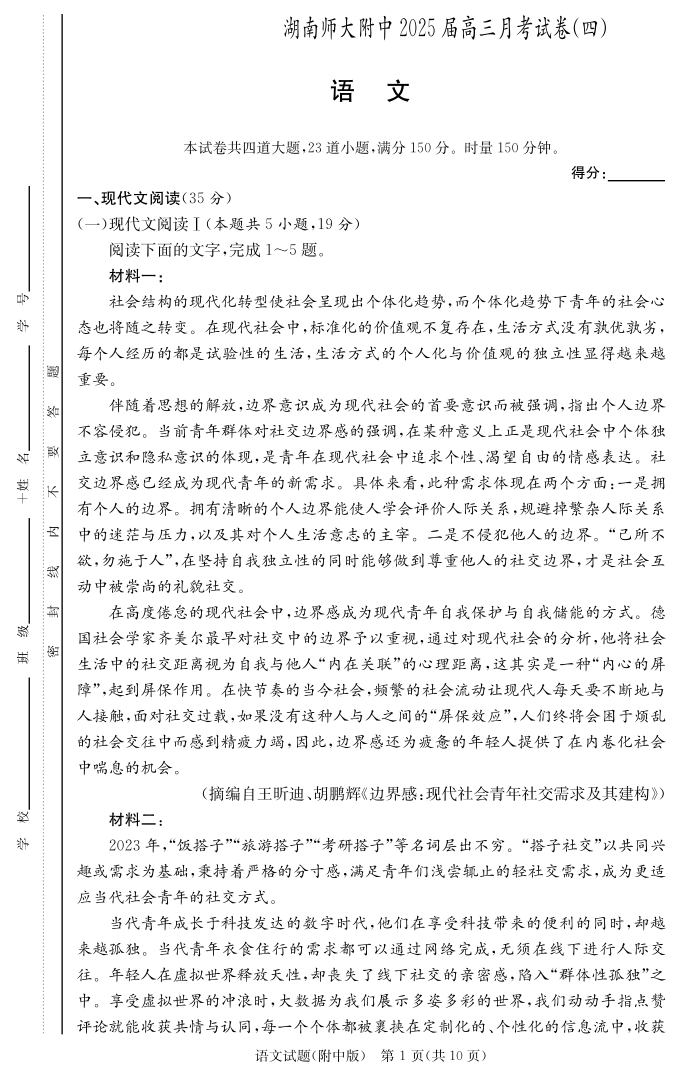 湖南师范大学附属中学2025届高三上学期月考(四)语文