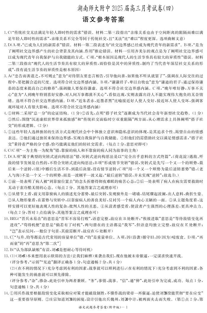 湖南师范大学附属中学2025届高三上学期月考(四)语文答案