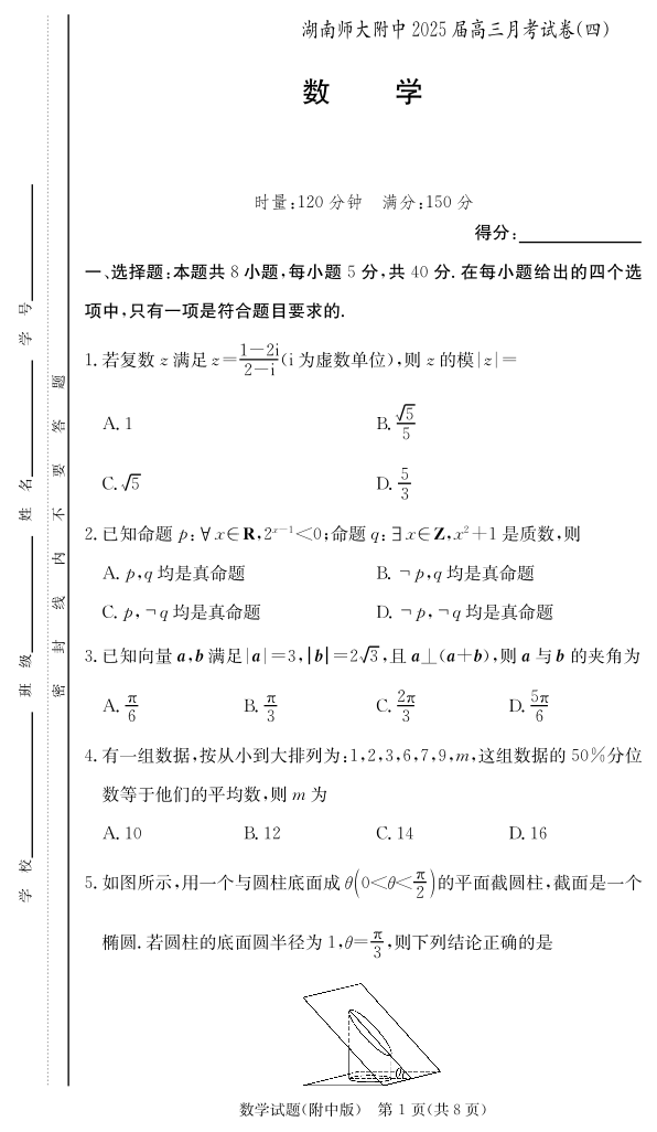 湖南师范大学附属中学2025届高三上学期月考(四)数学