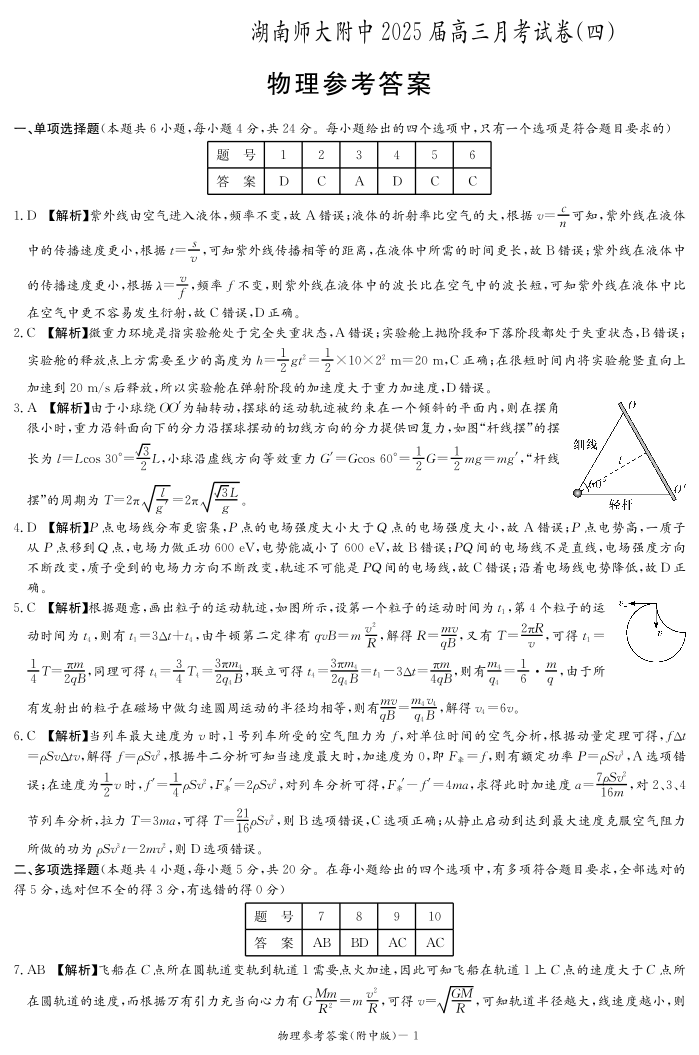 湖南师范大学附属中学2025届高三上学期月考(四)物理答案