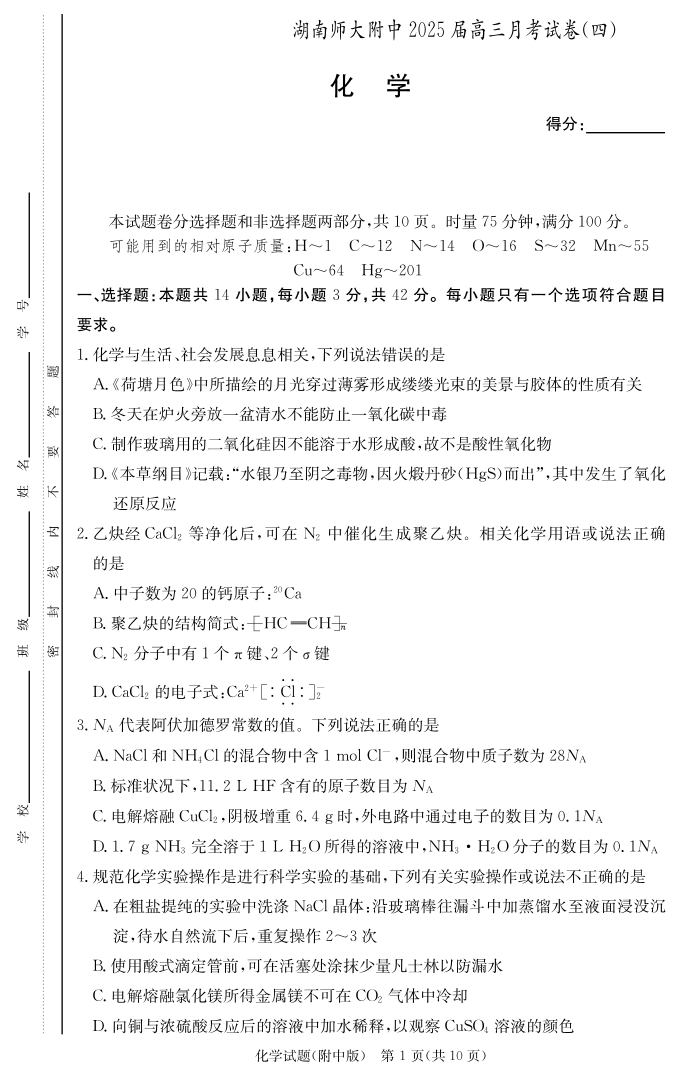 湖南师范大学附属中学2025届高三上学期月考(四)化学