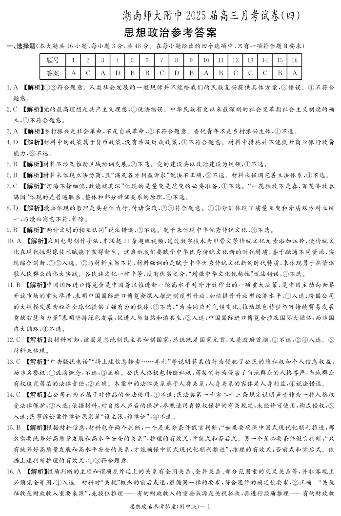 湖南师范大学附属中学2025届高三上学期月考(四)政治答案