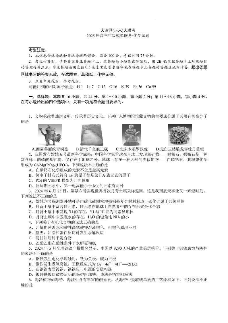 广东省大湾区(正禾)大联考2025届高三上学期12月模拟联考化学PDF版含答案