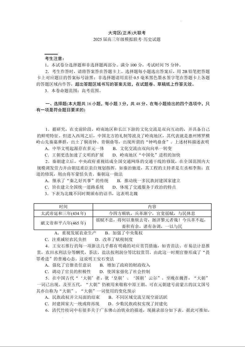 广东省大湾区(正禾)大联考2025届高三上学期12月模拟联考历史Word版含答案