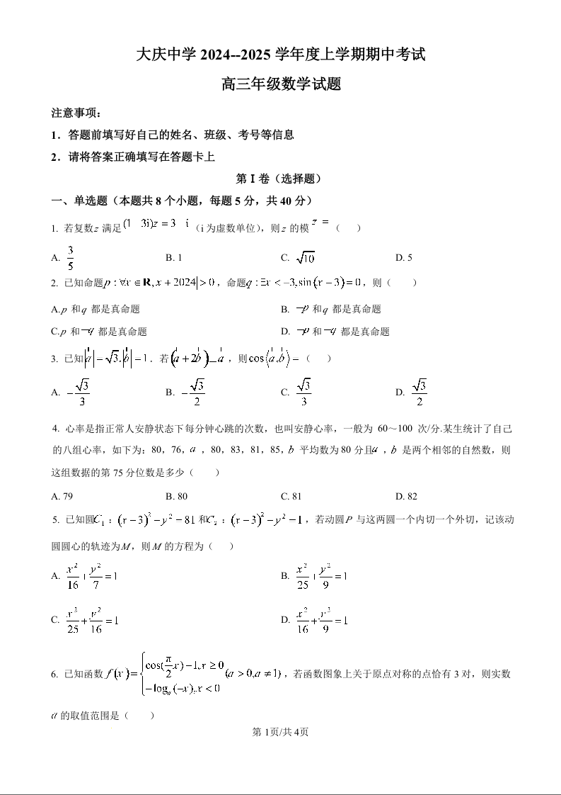 黑龙江省大庆市大庆中学2025届高三上学期10月期中考试数学(原卷版)