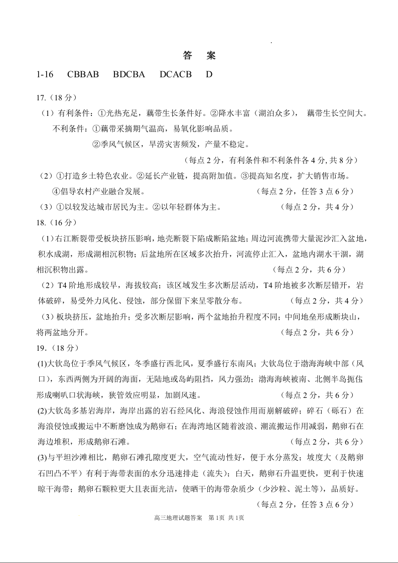 黑龙江省大庆市大庆中学2025届高三上学期10月期中考试地理答案