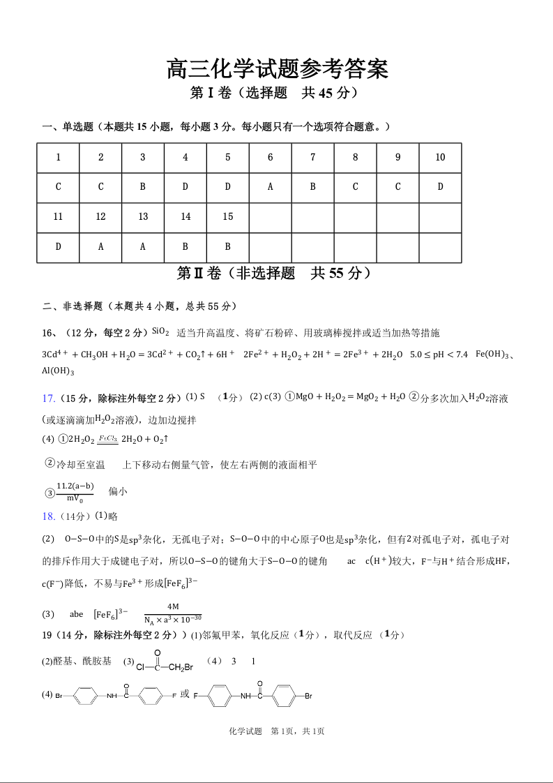 黑龙江省大庆市大庆中学2025届高三上学期10月期中考试化学答案