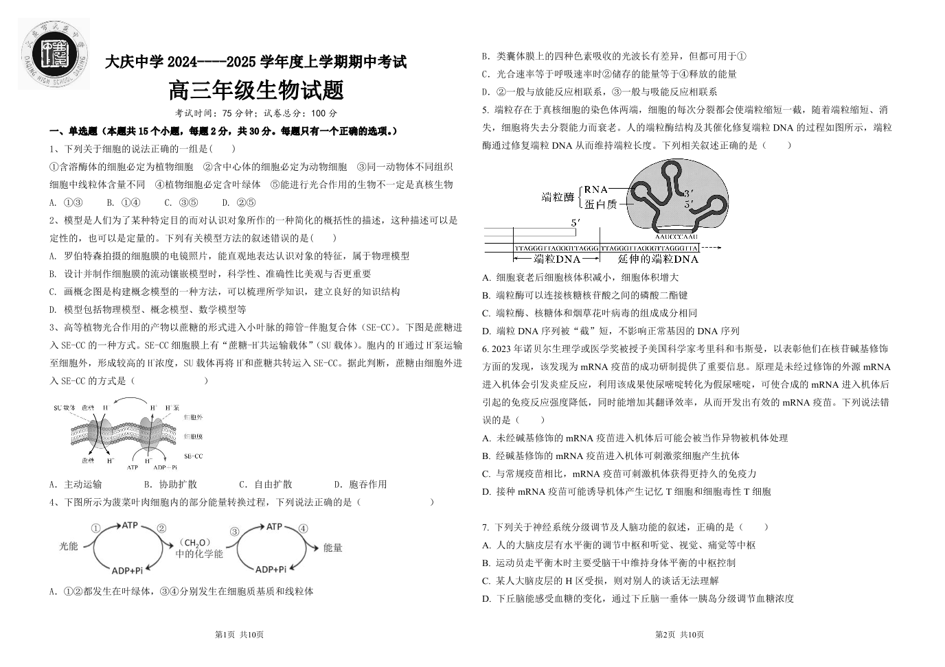 黑龙江省大庆市大庆中学2025届高三上学期10月期中考试生物