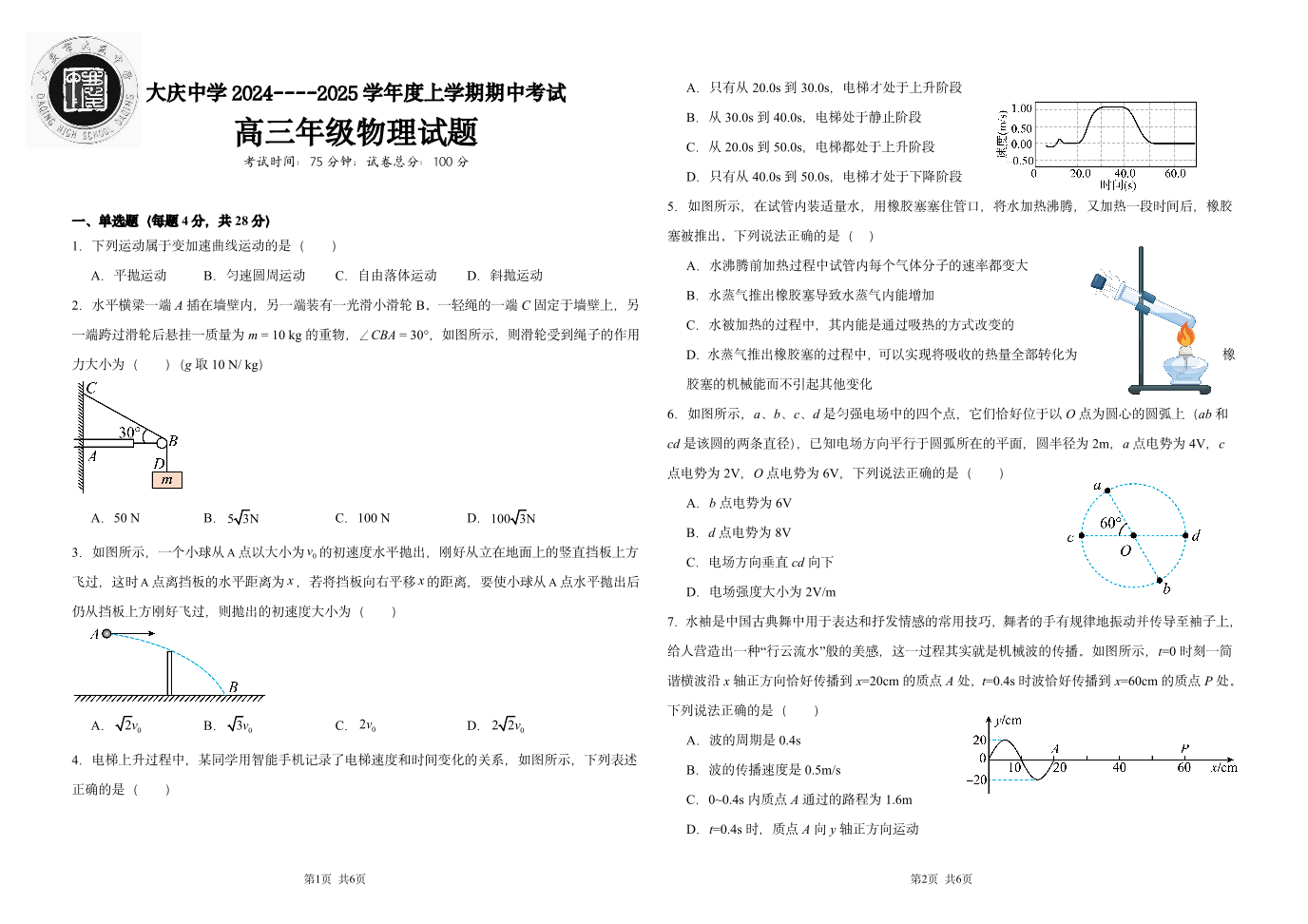 黑龙江省大庆市大庆中学2025届高三上学期10月期中考试物理