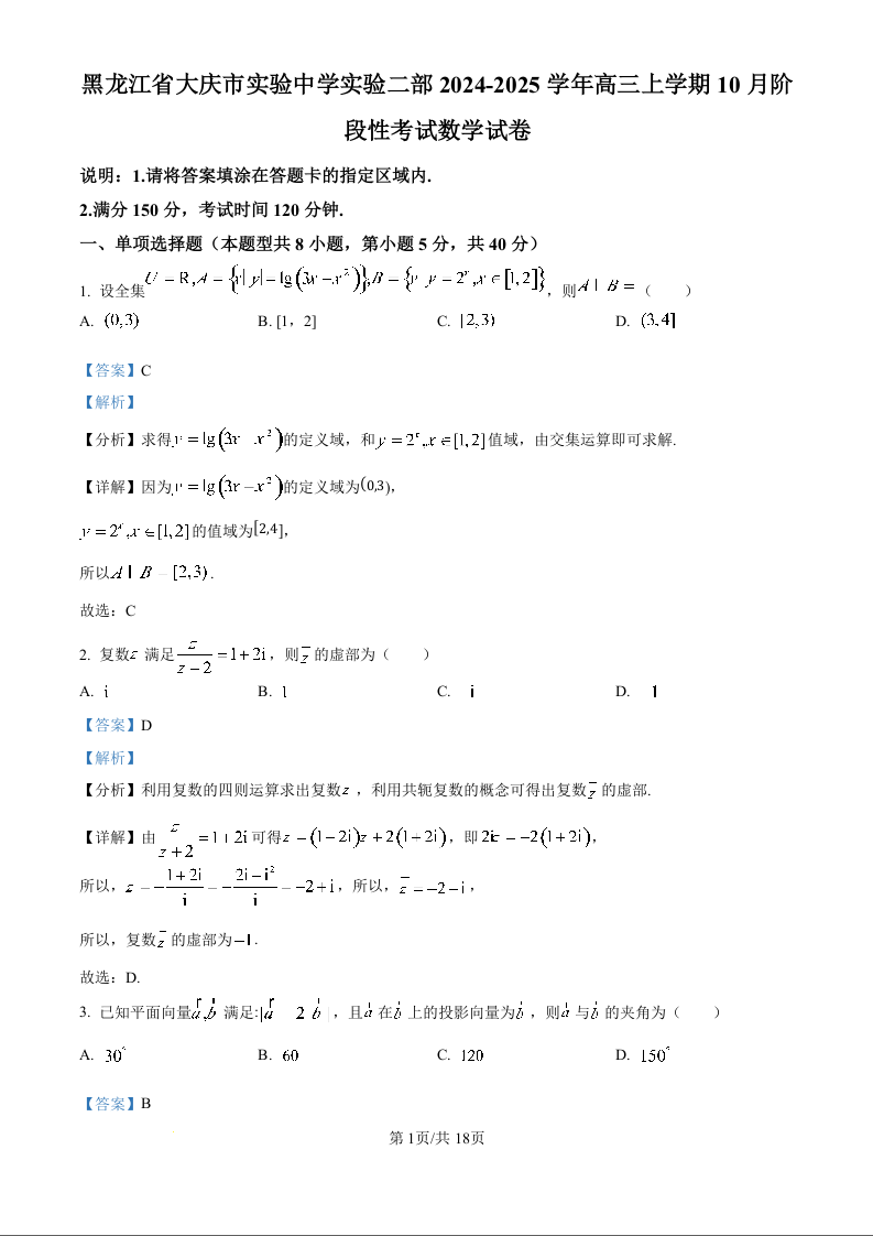 黑龙江省大庆市实验中学实验二部2022级高三下学期10月月考数学试卷(解析版)