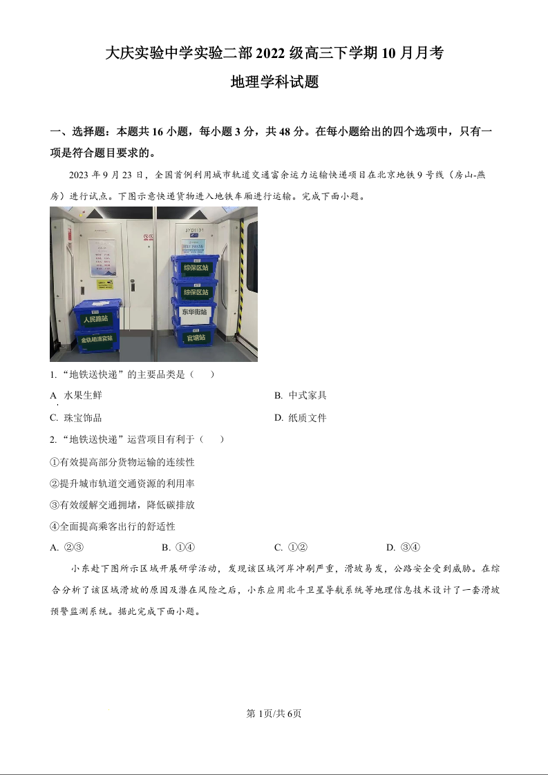 黑龙江省大庆市实验中学实验二部2022级高三下学期10月月考地理(原卷版)