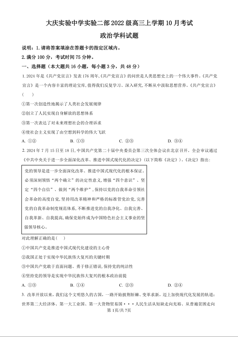 黑龙江省大庆市实验中学实验二部2022级高三下学期10月月考政治试卷(原卷版)