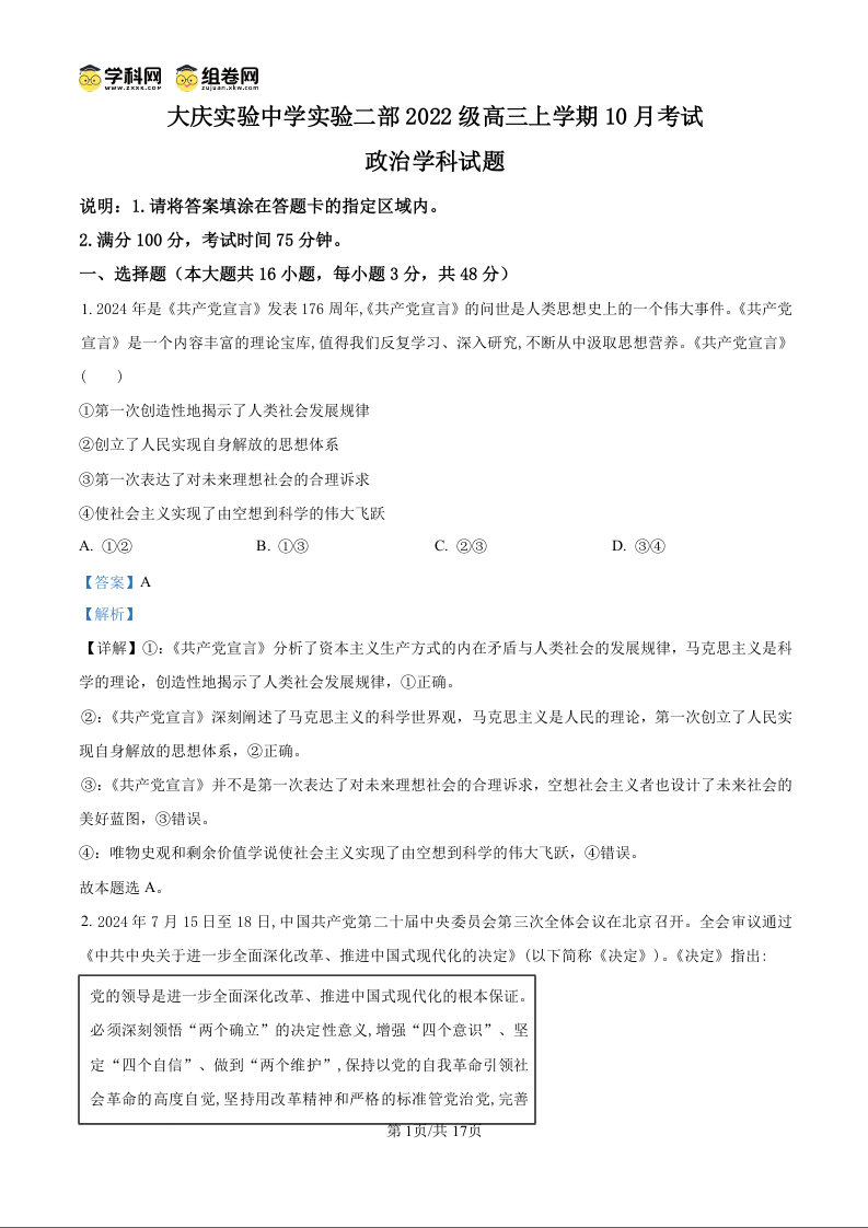 黑龙江省大庆市实验中学实验二部2022级高三下学期10月月考政治试卷(解析版)