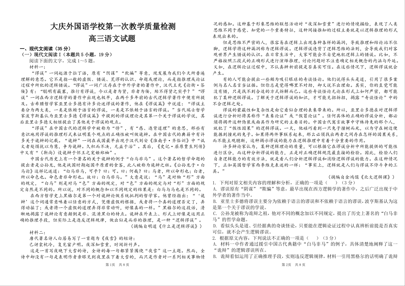 黑龙江省大庆外国语学校2025届高三上学期第一次教学质量检测语文试卷