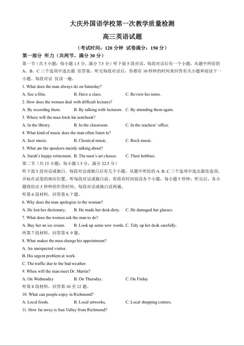 黑龙江省大庆外国语学校2025届高三上学期第一次教学质量检测英语试卷+答案