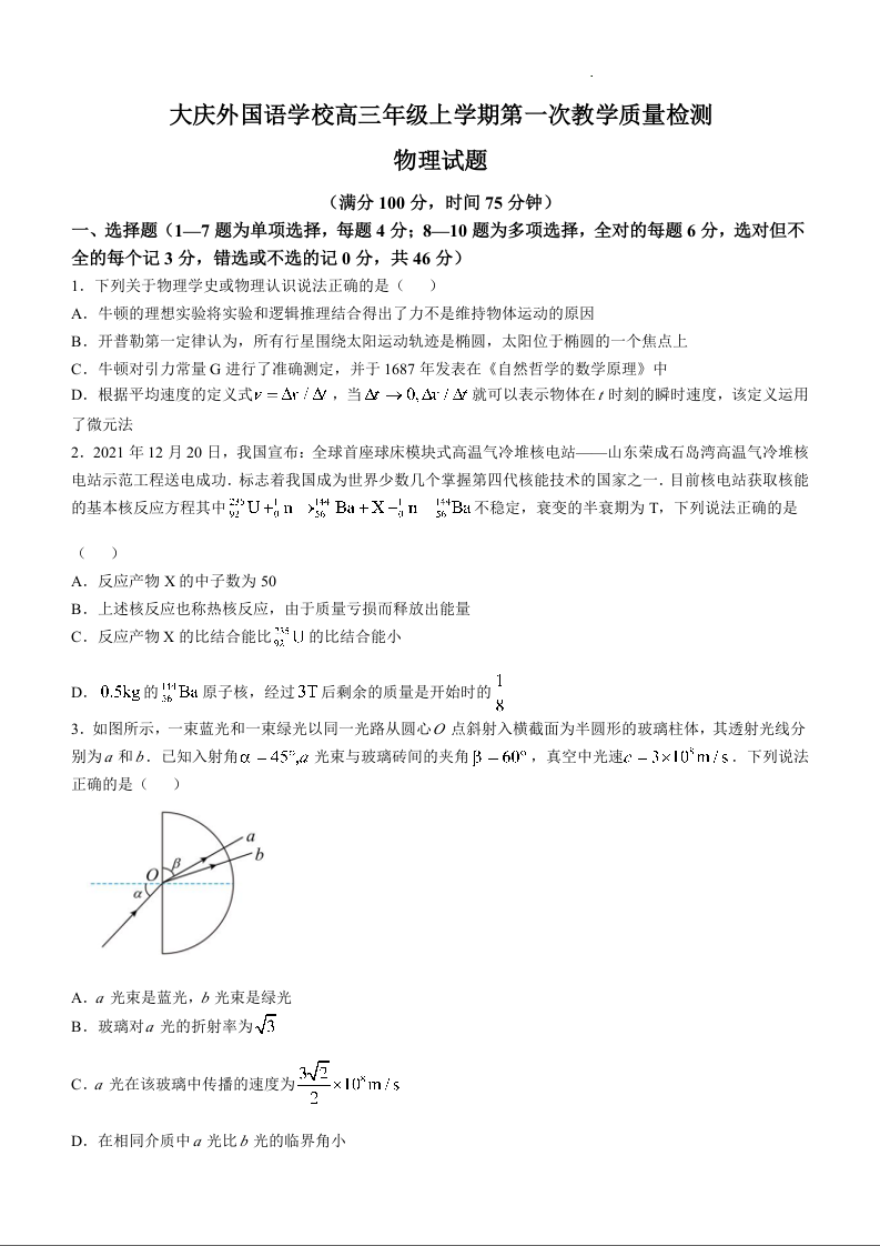 黑龙江省大庆外国语学校2025届高三上学期第一次教学质量检测物理试卷+答案