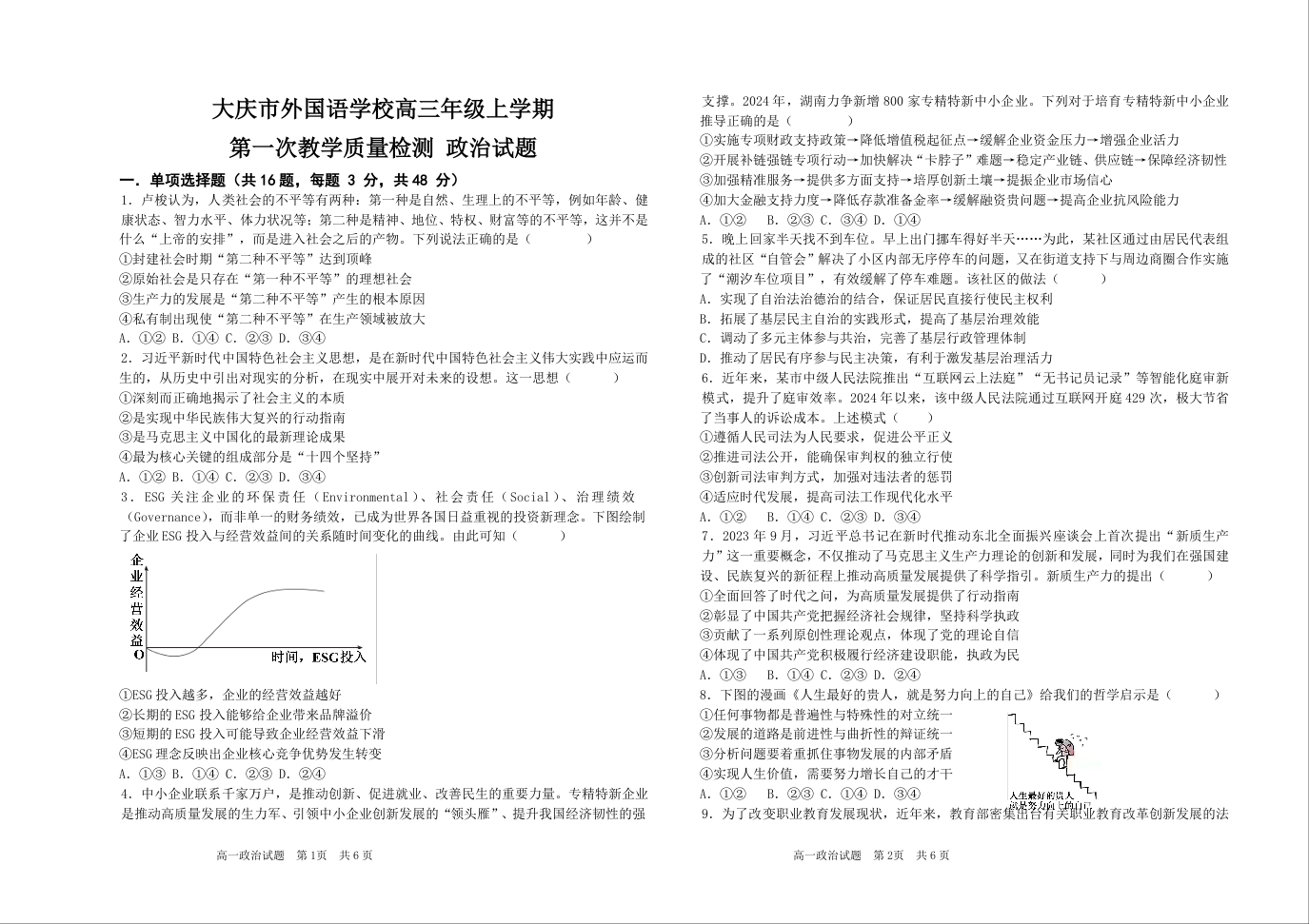 黑龙江省大庆外国语学校2025届高三上学期第一次教学质量检测政治试卷