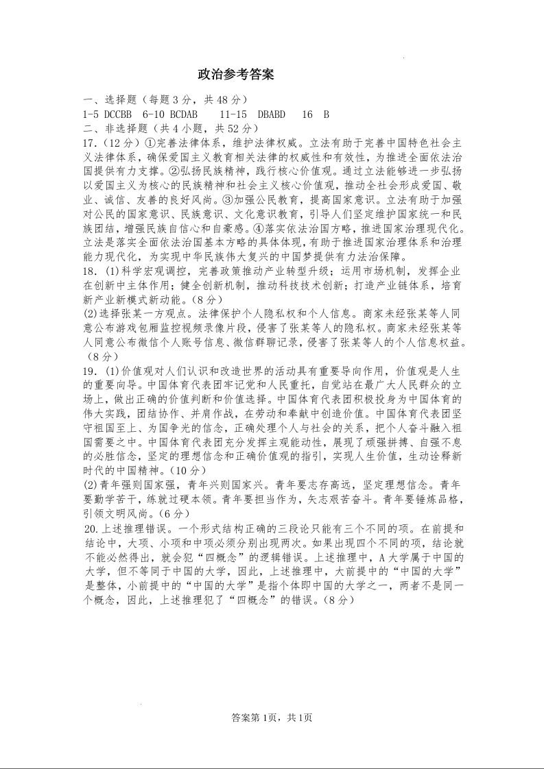 黑龙江省大庆外国语学校2025届高三上学期第一次教学质量检测政治答案