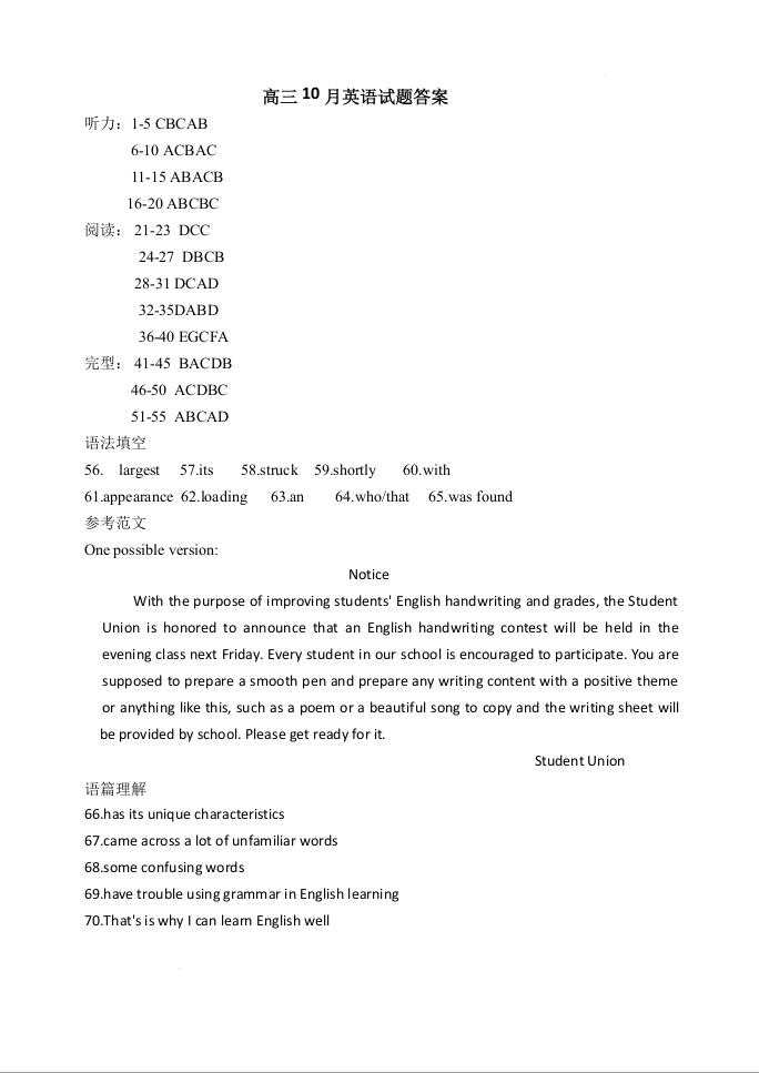 黑龙江省佳木斯市第八中学2025届高三上学期10月月考英语答案