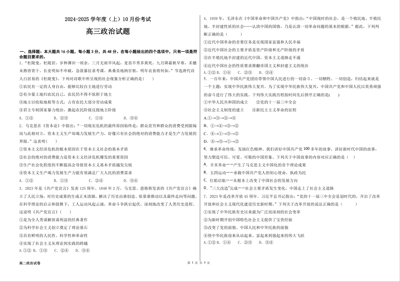黑龙江省佳木斯市第八中学2025届高三上学期10月月考政治