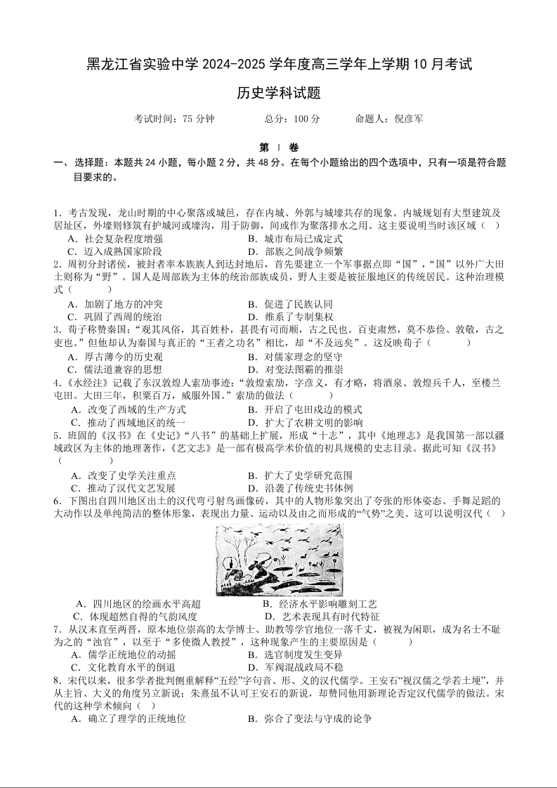 黑龙江省实验中学2024-2025学年度高三学年上学期第二次月考历史试卷