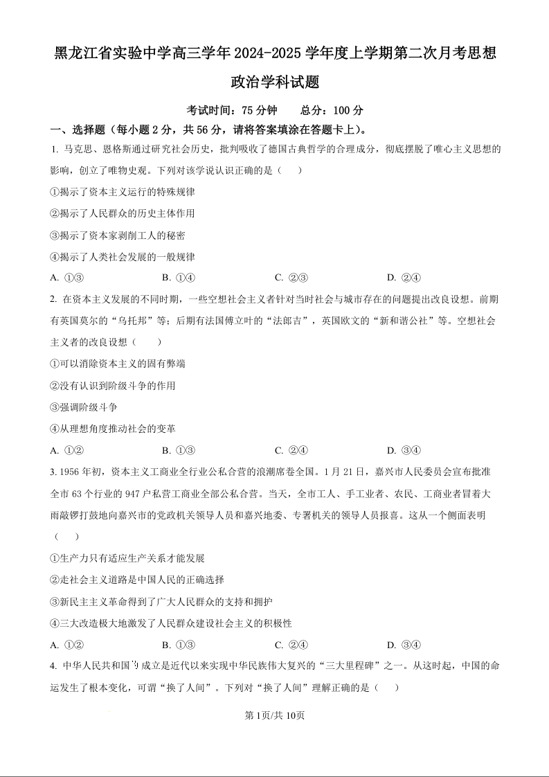 黑龙江省实验中学2024-2025学年度高三学年上学期第二次月考政治试题(原卷版)
