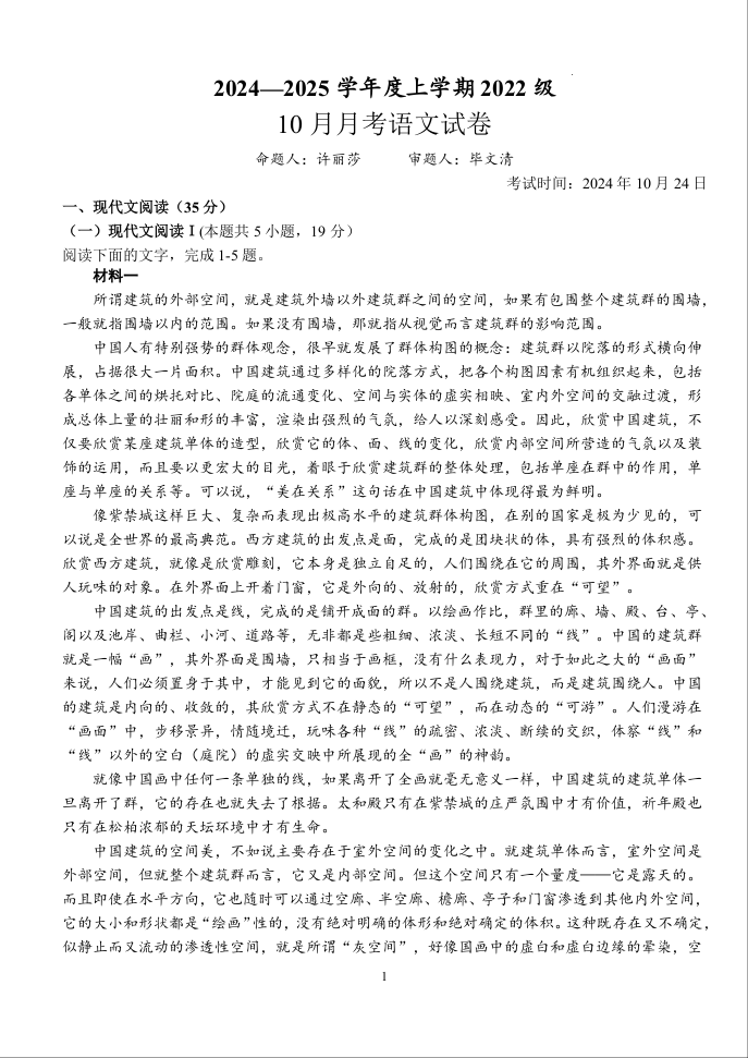 湖北省荆州市沙市中学2024-2025学年度上学期2022级10月月考语文