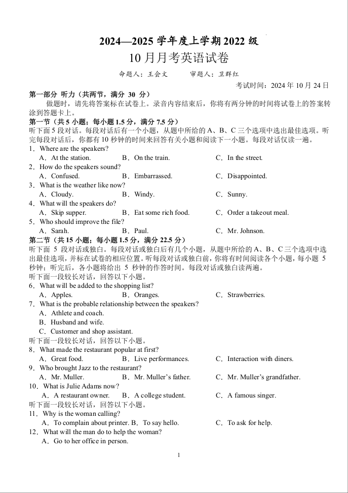湖北省荆州市沙市中学2024-2025学年度上学期2022级10月月考英语