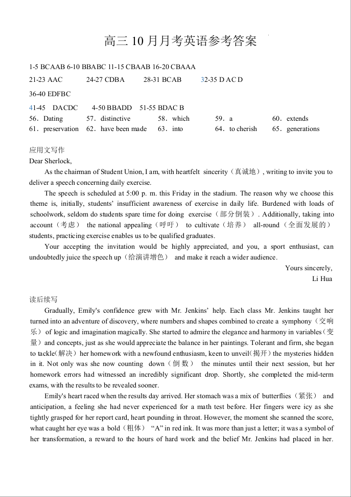 湖北省荆州市沙市中学2024-2025学年度上学期2022级10月月考英语答案