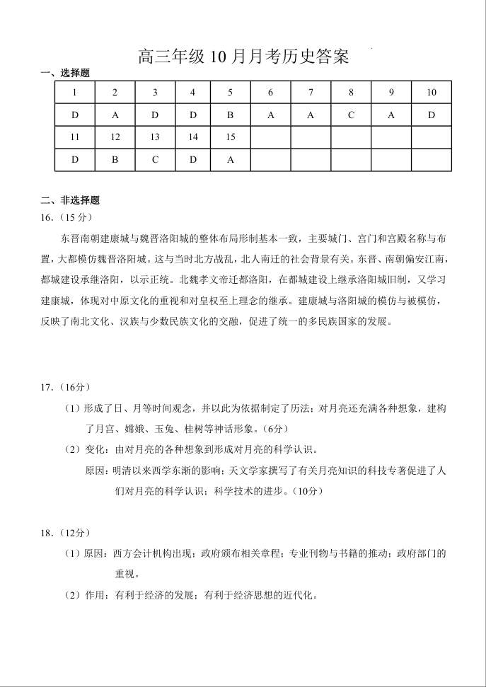 湖北省荆州市沙市中学2024-2025学年度上学期2022级10月月考历史答案
