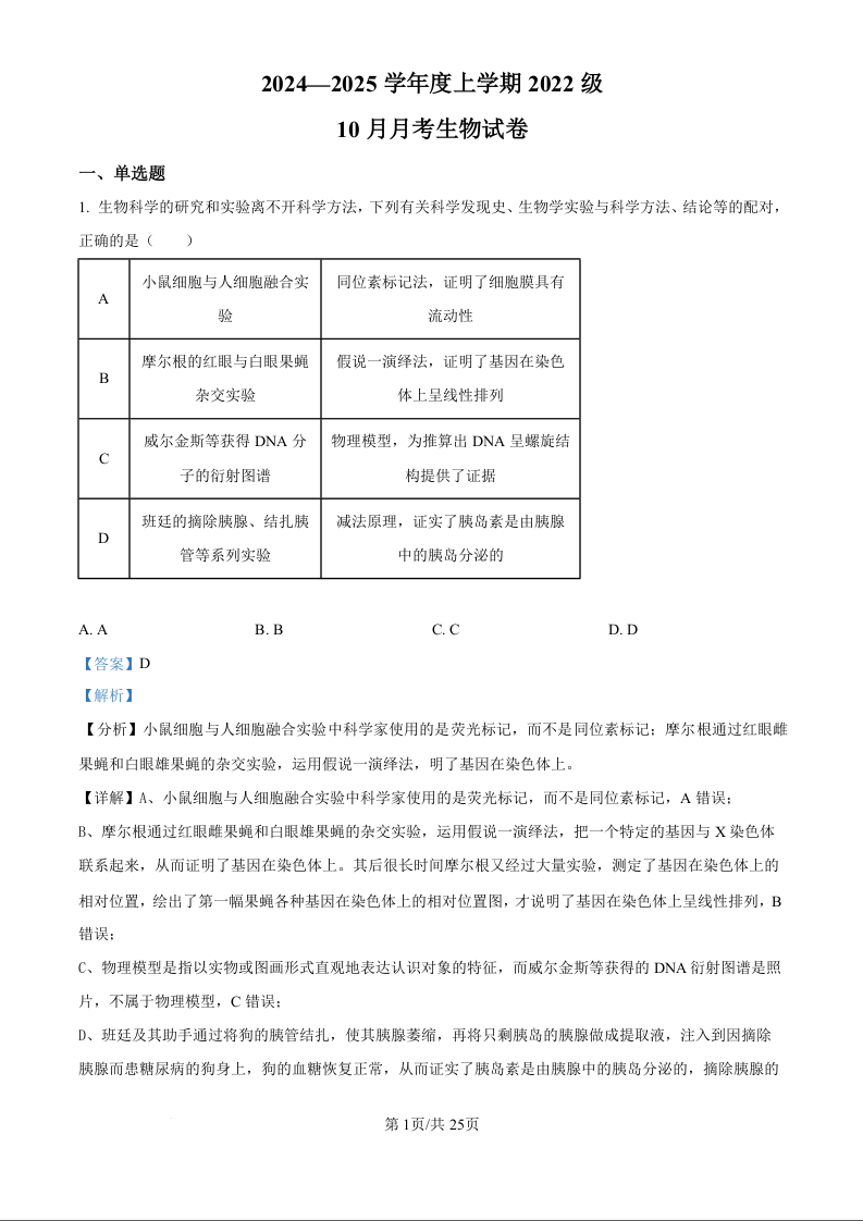 湖北省荆州市沙市中学2024-2025学年度上学期2022级10月月考生物试题(解析版)