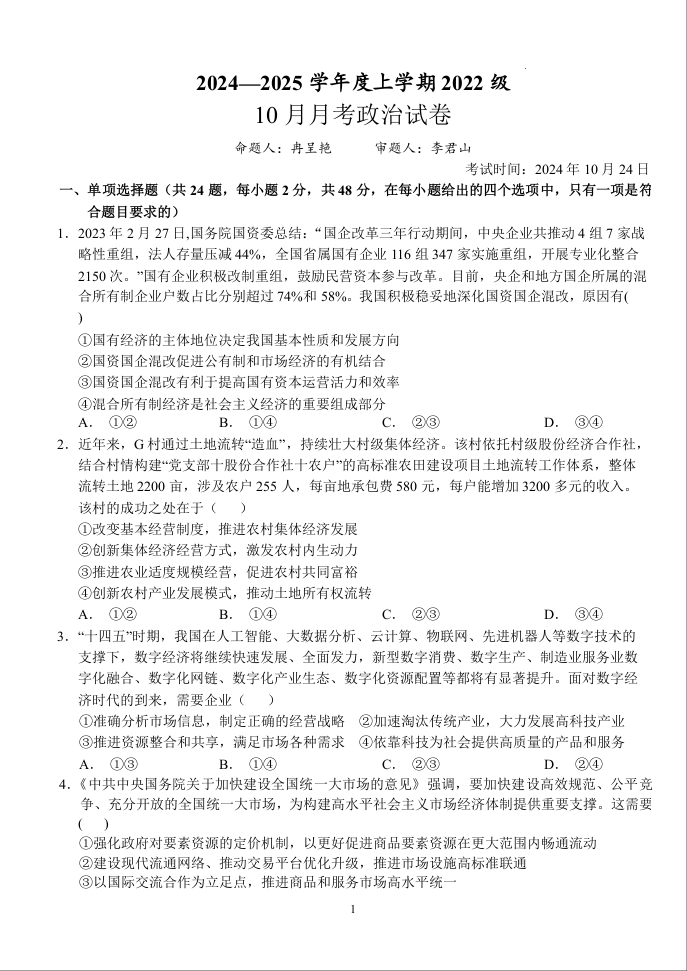 湖北省荆州市沙市中学2024-2025学年度上学期2022级10月月考政治