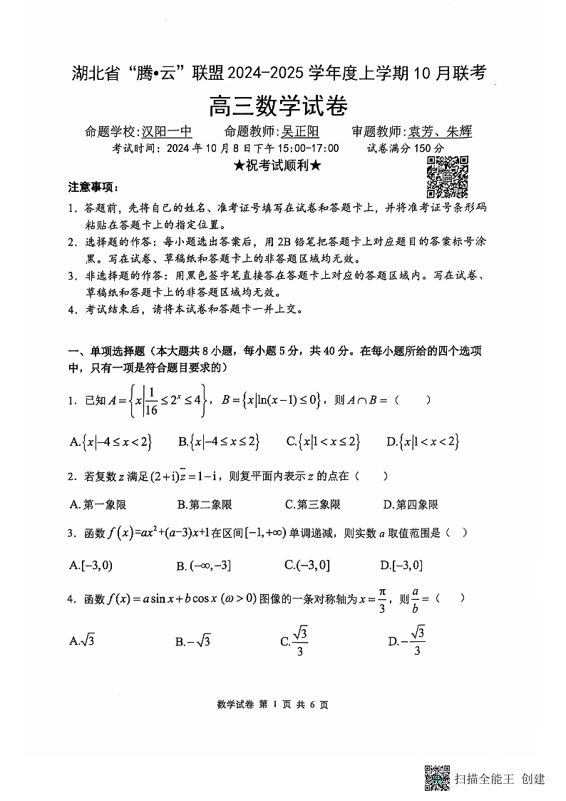 湖北省腾云联盟2024-2025学年度上学期10月联考数学试卷